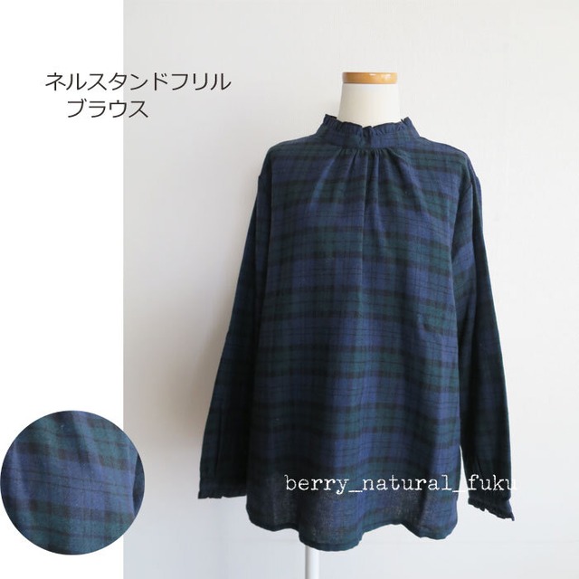 SALE ネル フリルスタンド衿 ブラックウォッチ ブラウス 綿混 起毛 コットン プチプラ 51-1110 通販 7612 ネコポス便発送可