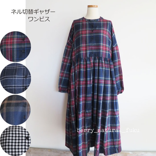 SALE ネル 切替ギャザー ワンピース プチプラ アソートチェック柄 綿混 長袖 秋冬 4108 通販 8021
