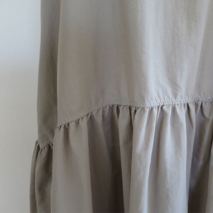 切替デザインとギャザーが絶妙に組み合わさり、女性らしいシルエットを演出。