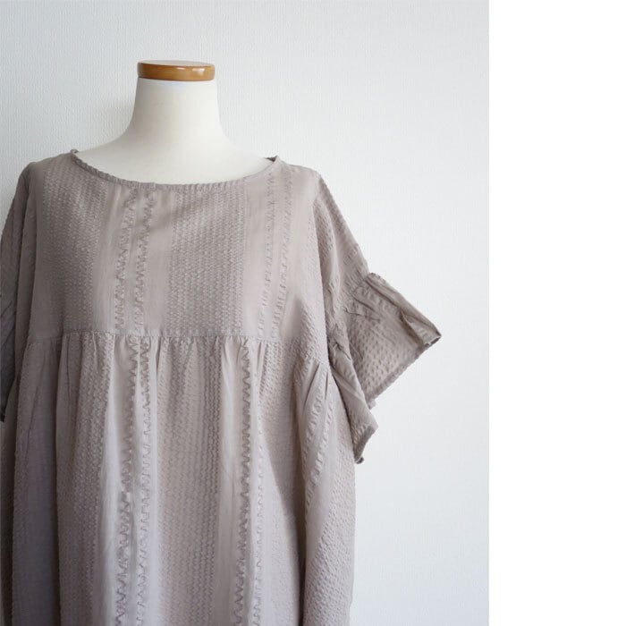 フロントは胸下から切替えギャザーを施し、裾にかけてゆるやかに広がるAラインシルエット。