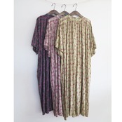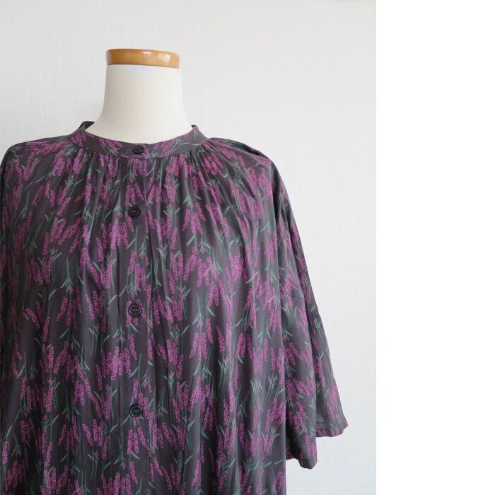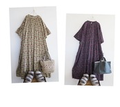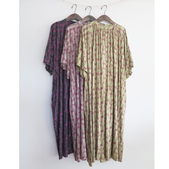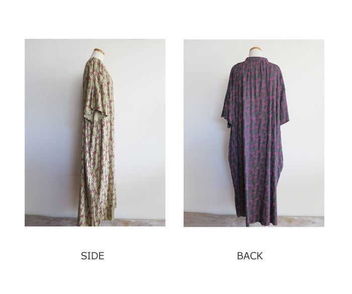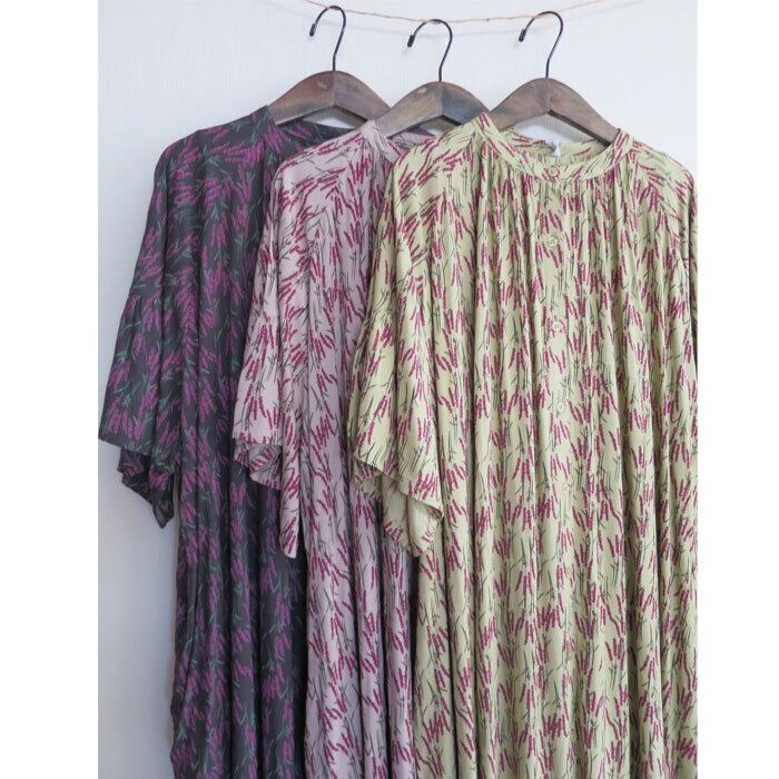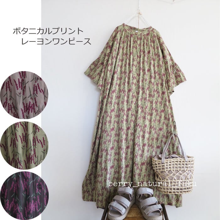レーヨン特有の落ち感と、なめらかな肌あたりが心地よいボタニカルプリントのフレアスリーブワンピース。