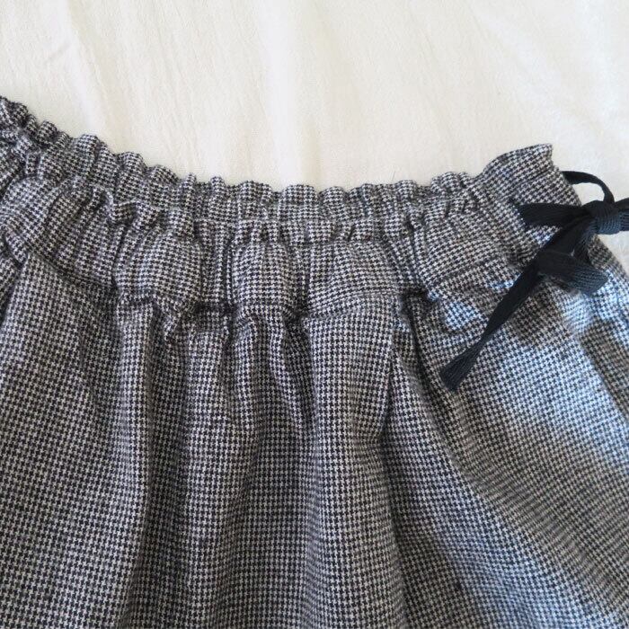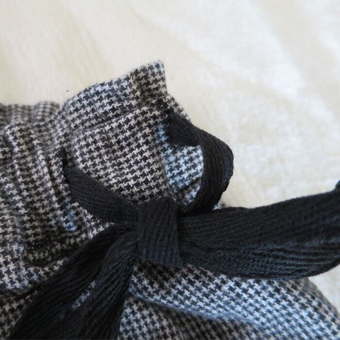 左サイドは紐仕様にし、ウエストサイズ調整可能。リボンがワンポイントに。