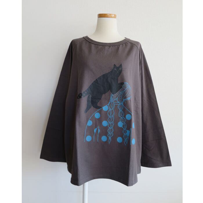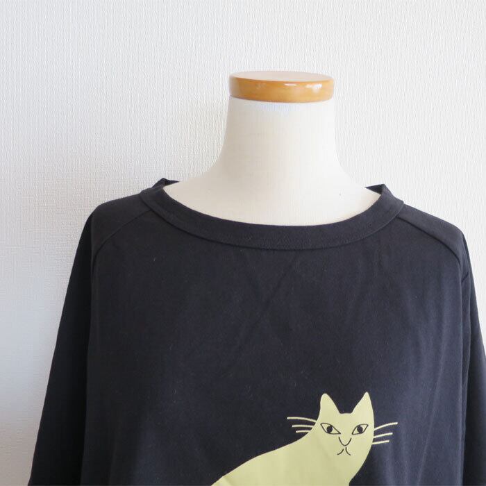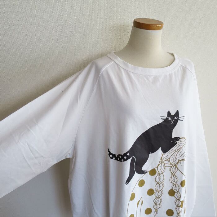 肩に乗る猫のデザインがプリントされた長袖ワイドカットソーです。