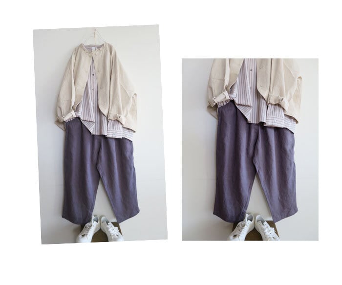 太もも周りにゆとりがあり、テーパードの効いたアンクル丈のシルエットです。