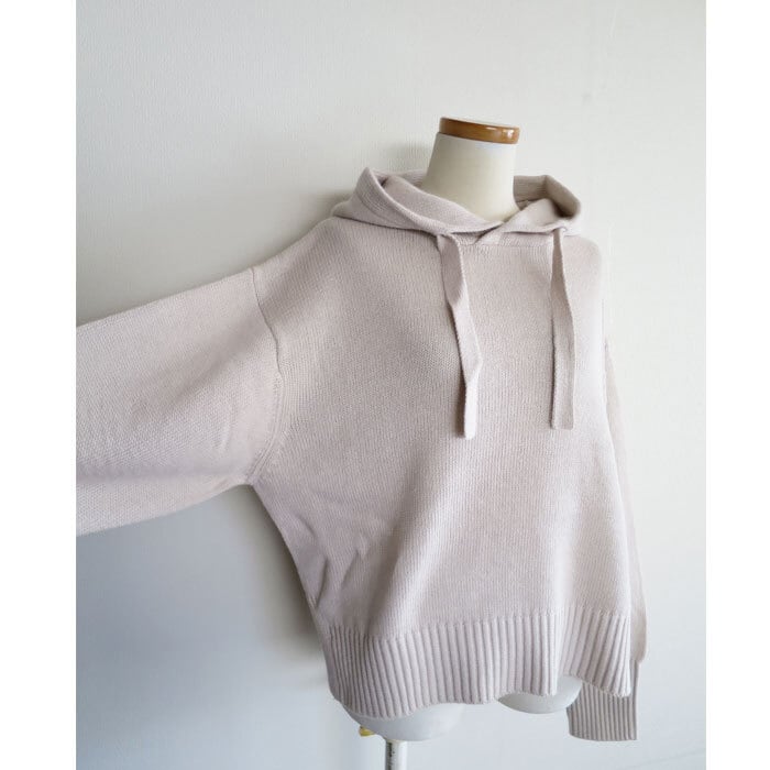 ノーカラージャケットに合わせて頂きやすいフード付きニットです。