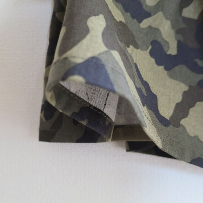 カジュアルなスタイルを演出する綿100%迷彩柄生地が特徴です。