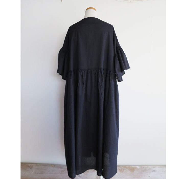 前後にたっぷりとギャザーを、袖にはフリルを施した存在感のあるワンピース。
