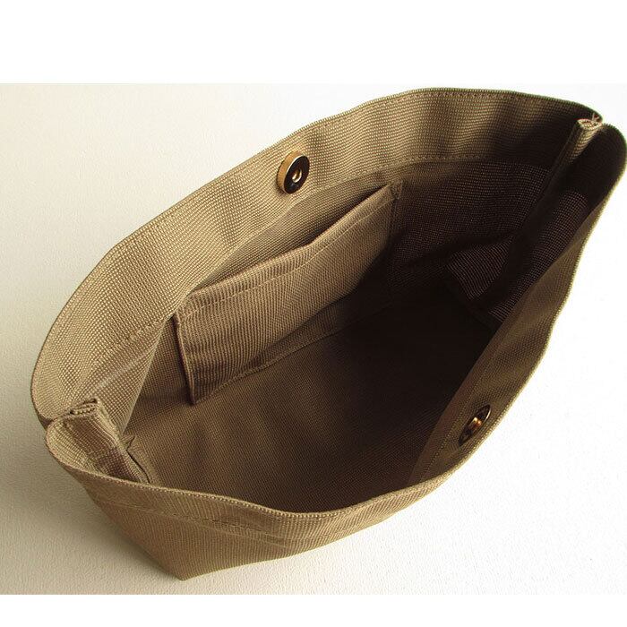 ポリエステル素材を使用した、軽量で持ち運びしやすいデザインが特徴のトートバッグ。