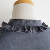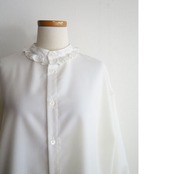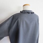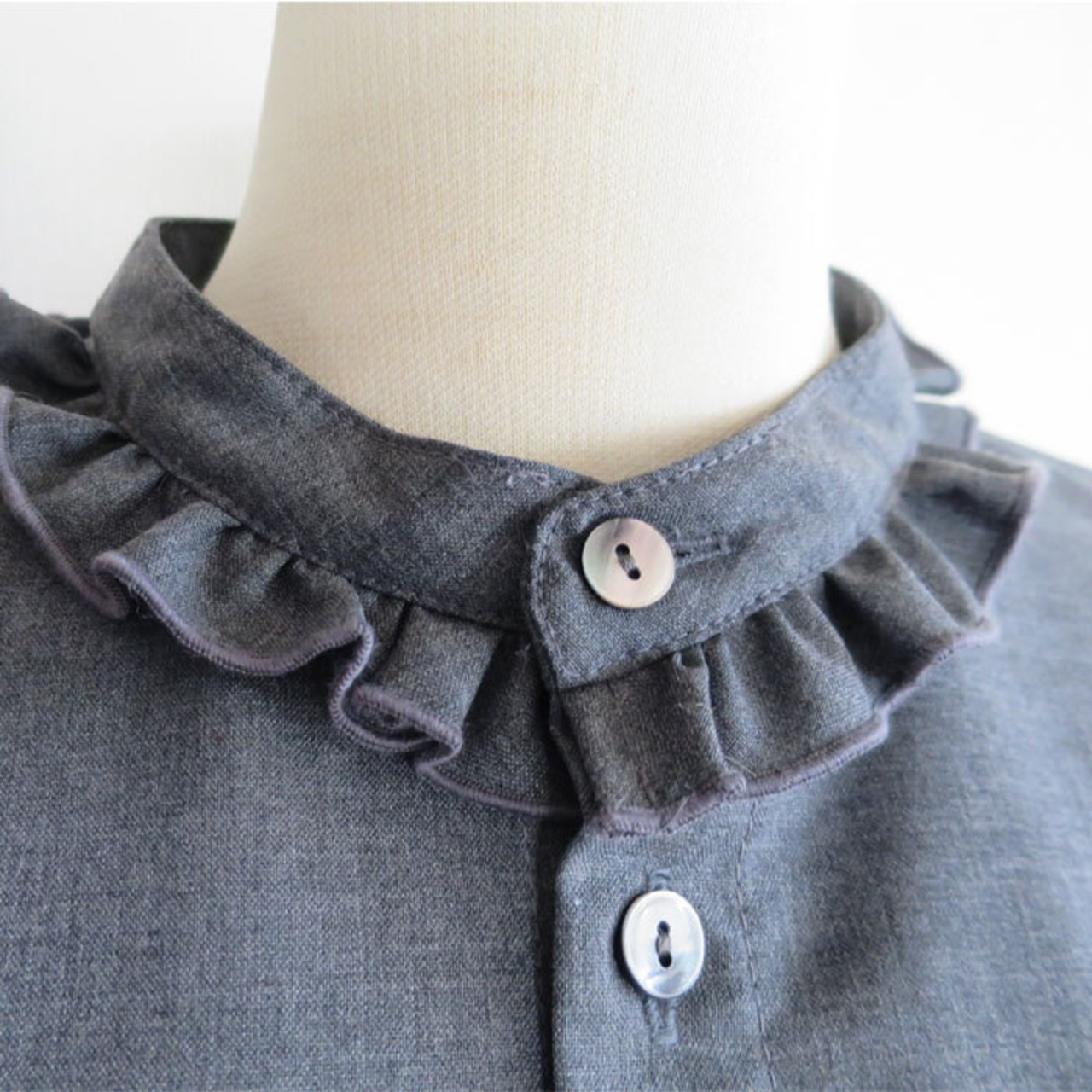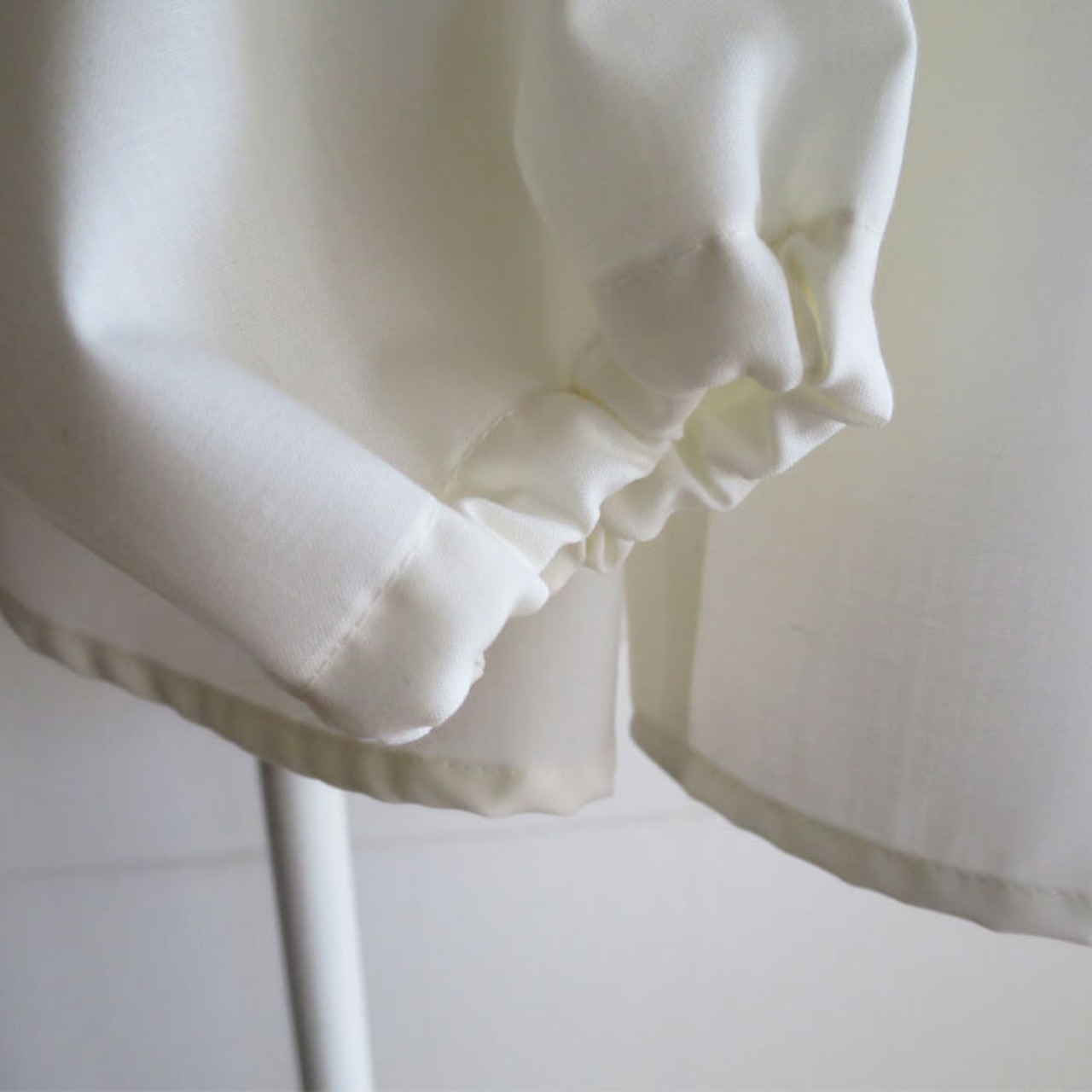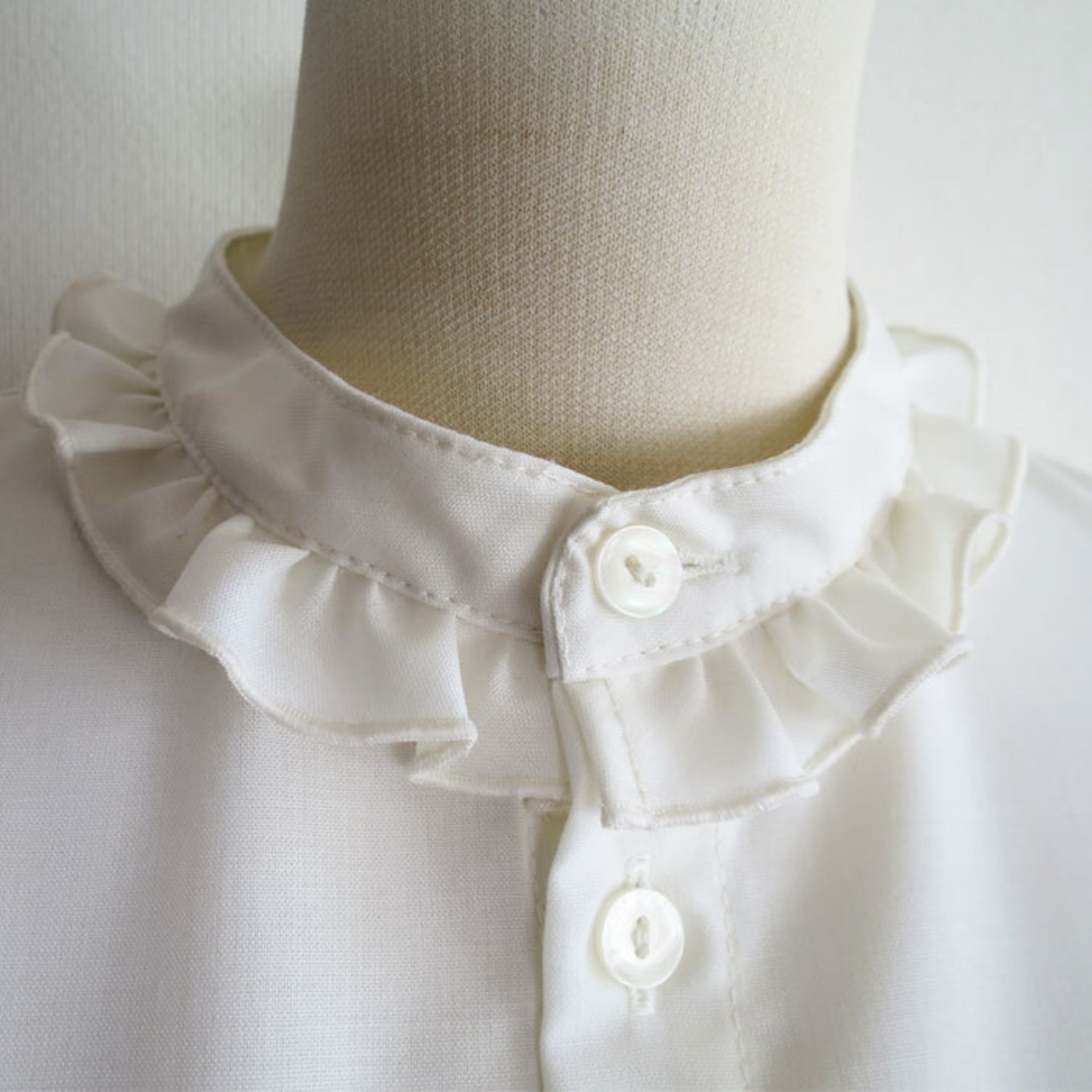 衿元には繊細なフリルが施されたデザインが特徴で、袖口に施されたゴムが女性らしいシルエットを引き立てます。