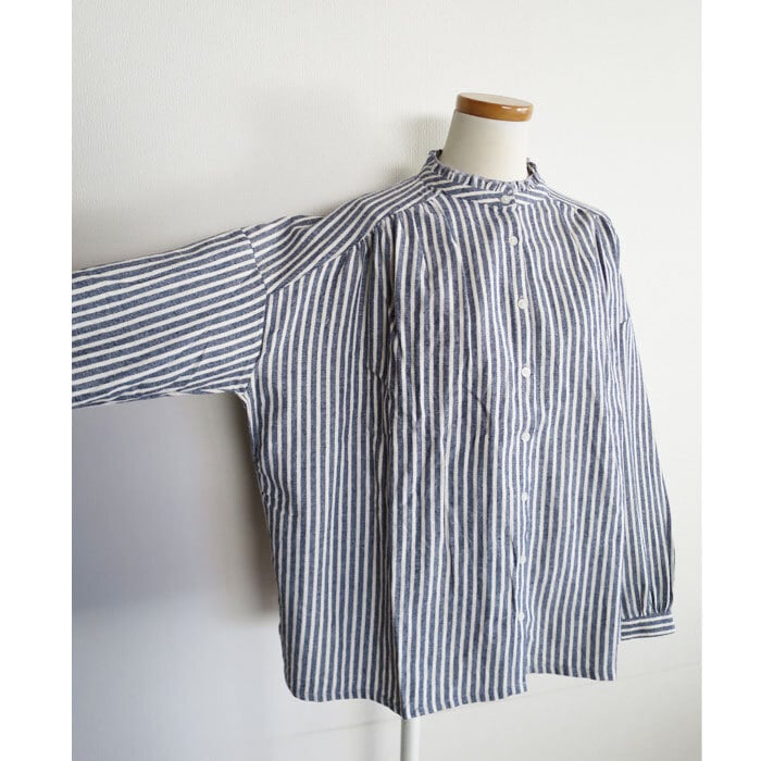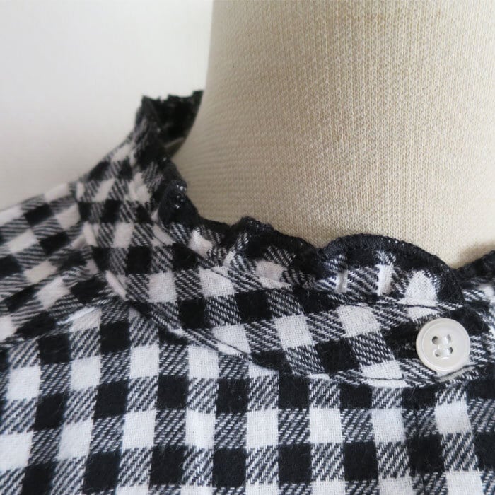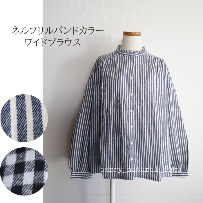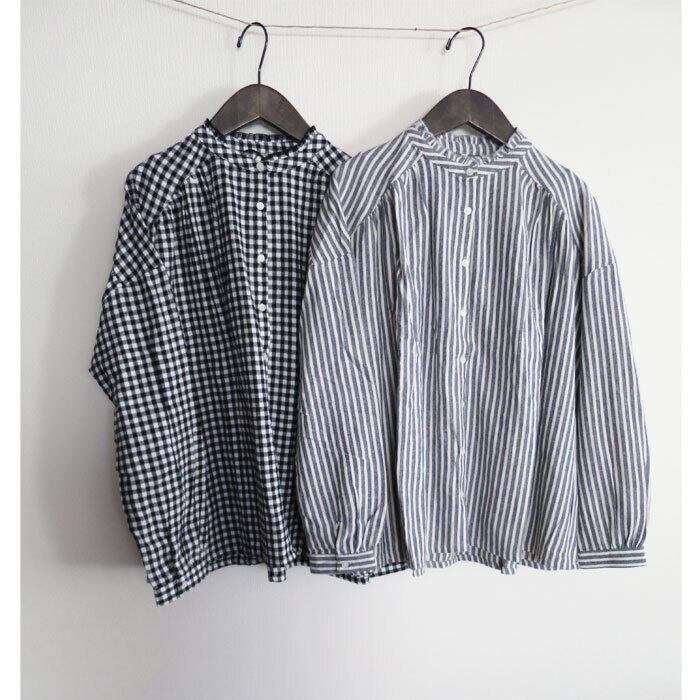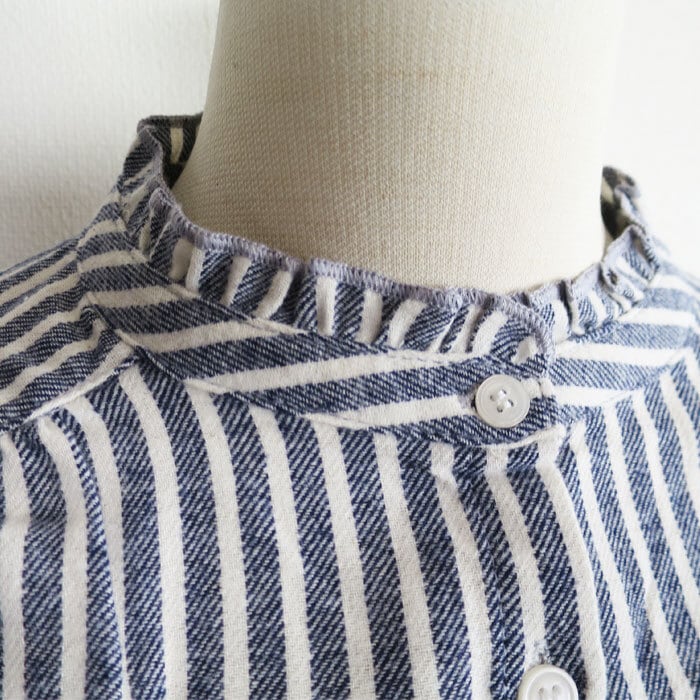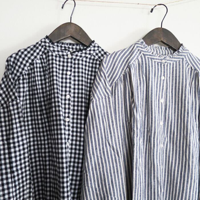 ストライプとギンガムの2柄。襟元スタンドフリルがポイント。